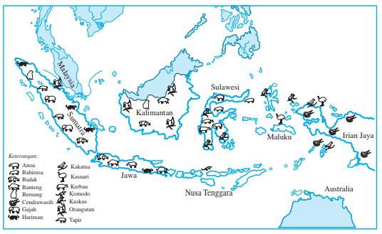 Amatilah peta persebaran fauna di Indonesia berikut ini!